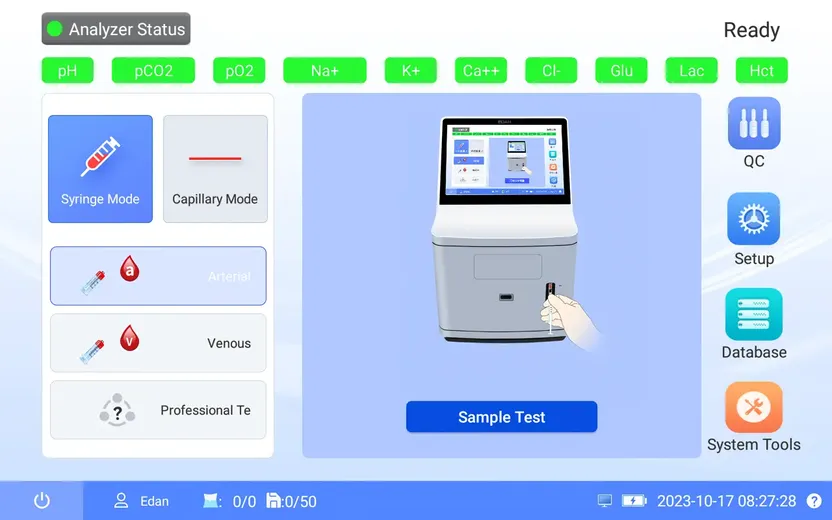 EDAN i500 — это компактная настольная система для анализа газов крови и электролитов. Прибор сочетает функциональность стационарных лабораторных приборов с малой занимаемой площадью и минимальными требованиями к обслуживанию, что делает его удобным для применения в реанимациях, операционных, приемных отделениях и отделениях интенсивной терапии.