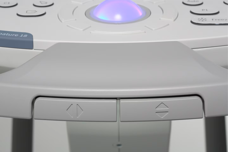 Voluson Signature унаследовал эргономику серии Expert. 23,8-дюймовый безрамочный монитор и Большой сенсорный экран обеспечивают точное управление и комфортное отображение. Консоль регулируется по высоте и наклону, поддерживает три активных порта для датчиков (четвертый порт доступен как опция) и возможность подключения беспроводного датчика Vscan Air™.