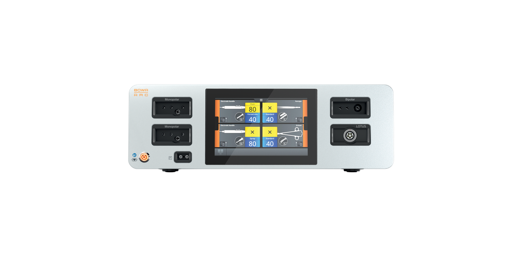Электрохирургический генератор BOWA ARC VIII с двумя монополярными и одним биполярным выходом, а также возможностью подключить ультразвуковой инструмент. На экране отображаются активные режимы и параметры мощности для каждого подключенного инструмента, что позволяет хирургу контролировать резание и коагуляцию в реальном времени